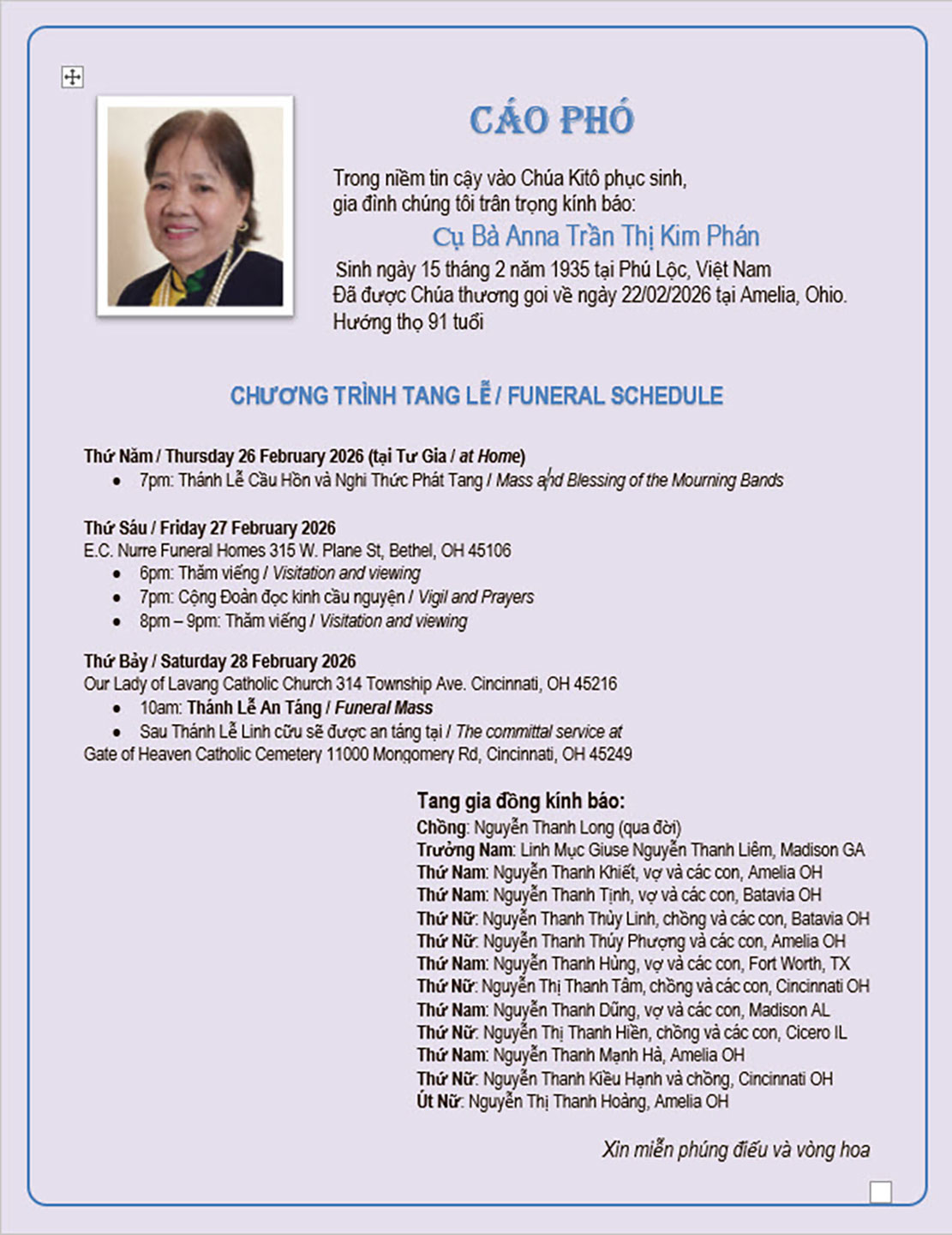 Cáo phó: Thân mẫu Cha Giuse Nguyễn Thanh Liêm, Madison GA vừa mới qua đời