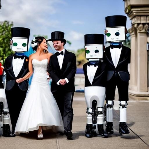 Đây là hình ảnh do AI tạo ra. Chúng tôi đã yêu cầu một bức ảnh chụp hai rô-bốt hoạt hình kết hôn, với cô dâu rô-bốt hoạt hình mặc váy cưới và chú rể rô-bốt hoạt hình trong bộ tuxedo và đội mũ chóp. Nhưng đây… thứ… là những gì chúng tôi có.
